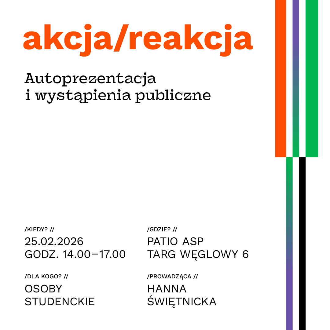 Zapraszamy na warsztaty pt. "Autoprezentacja i wystąpienia publiczne", przeznaczone dla osób studiujących na ASP w Gdańsku, które poprowadzi Hanna Świętnicka.