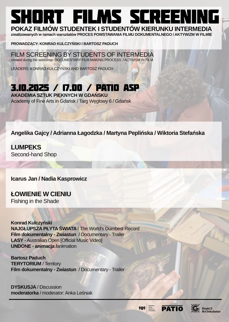 W ramach pokazu zobaczymy filmy, nad którymi intensywnie pracowały w ramach warsztatów osoby studiujące na kierunku Intermedia, przygotowując projekt od koncepcji scenariusza do finalnego rezultatu. Warsztaty oraz pokaz filmów realizowane są w ramach projektu Aktywizm w filmie.
